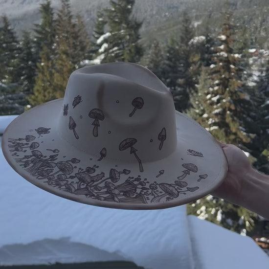 The Mushroom Rancher (Cream) is the perfect hat for any mushroom lover. Hand burned with a unique creative mushroom design, this hat is sure to make a statement. Made with high-quality materials for durability and style.
